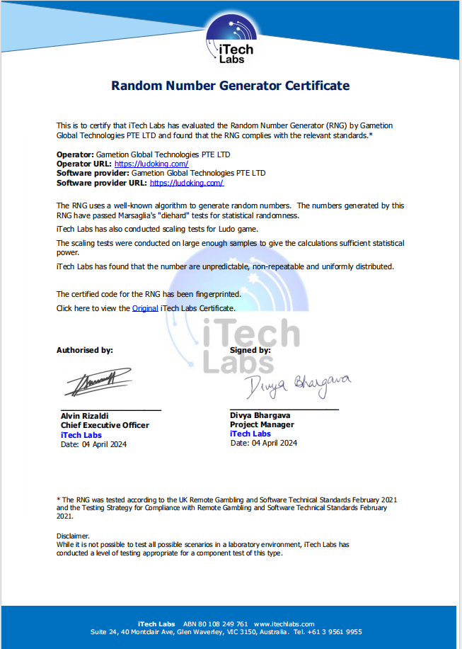 This is to certify that iTech Labs has evaluated the Random Number Generator (RNG) by Gametion Global Technologies PTE LTD and found that the RNG complies with the relevant standards.